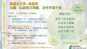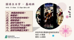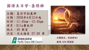 - 【新生命查经班】(一,10-11:30am),共12课,福音性查经线上课程,适合新朋友和初信者系统性地掌握福音的最基本的真理。4/20(一) 开课,徐传道带领。