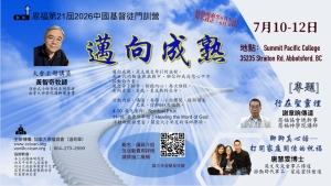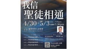 - 4/30 – 5/3(四–日,7:30pm) 第54届大温研经培灵会「我信圣徒相通」,讲员郭文池牧师。鼓励参加实体聚会於温哥华华人宣道会。届时国语部将於綫上一起参加,Zoom ID#811 9581 4606,密码2026。详见海报,查询∶Ade 姐妹。